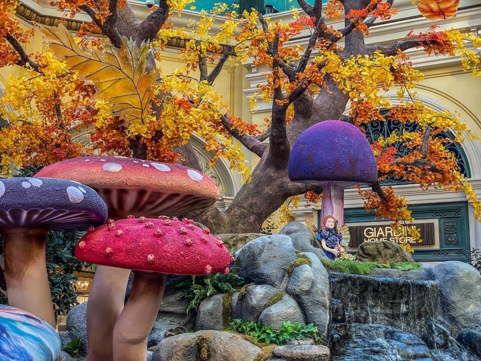 While the fountain show was incredible, the inside of the hotel/casino was even more spectacular. On my first day, I walked over to the lobby and enjoying the beautiful fall colors before I even made it through the revolving doors. Like a pied piper, the decorations lead me to a fairy land of delight. I captured photo after photo of tiny characters living under toadstools and in trees, while animal characters slept on rocks by flowing rivers. The words of Roald Dahl, who wrote Charlie and The Chocolate Factory, came to mind while I was exploring the fantasy world The Bellagio had created, “If you want to view Paradise, simply look around and view it.” It truly was spectacular.